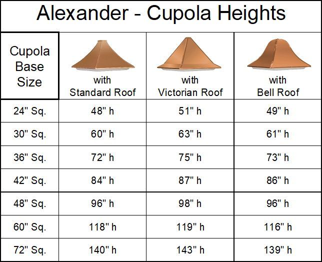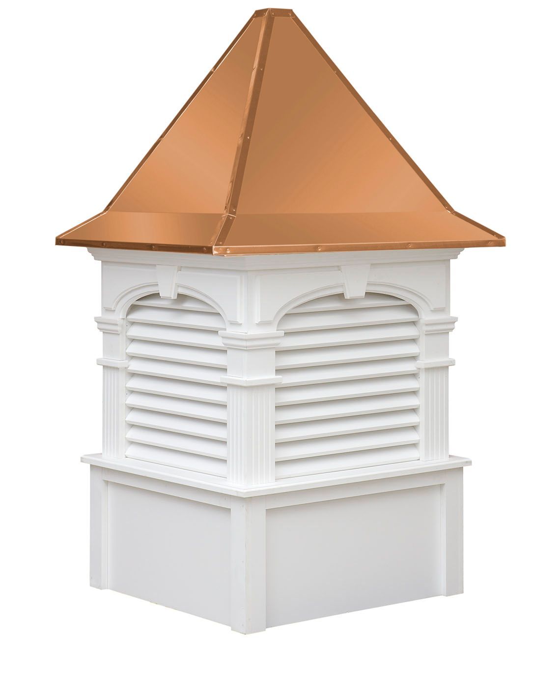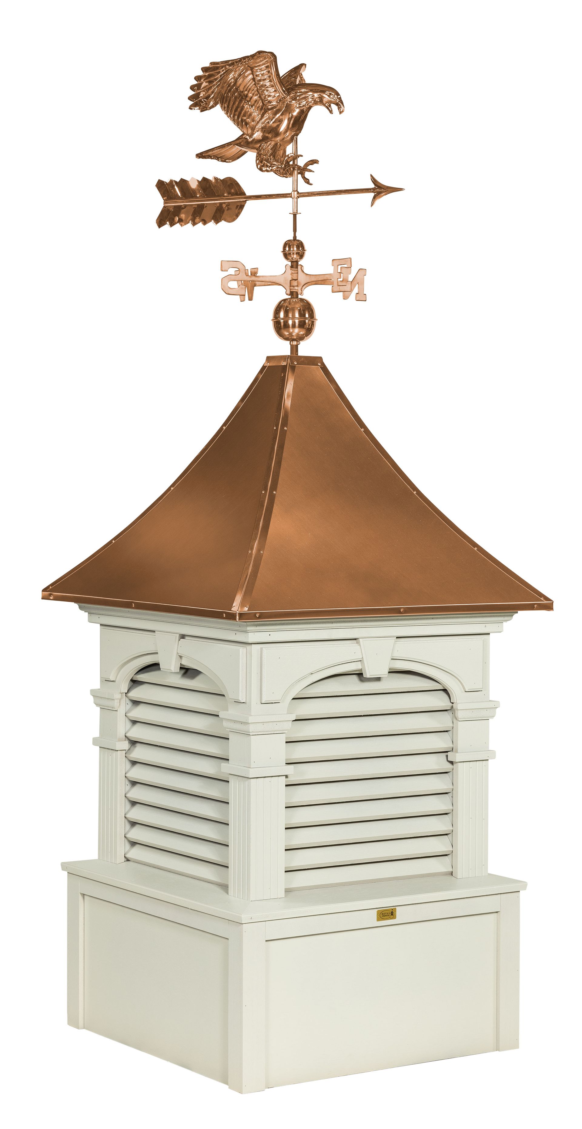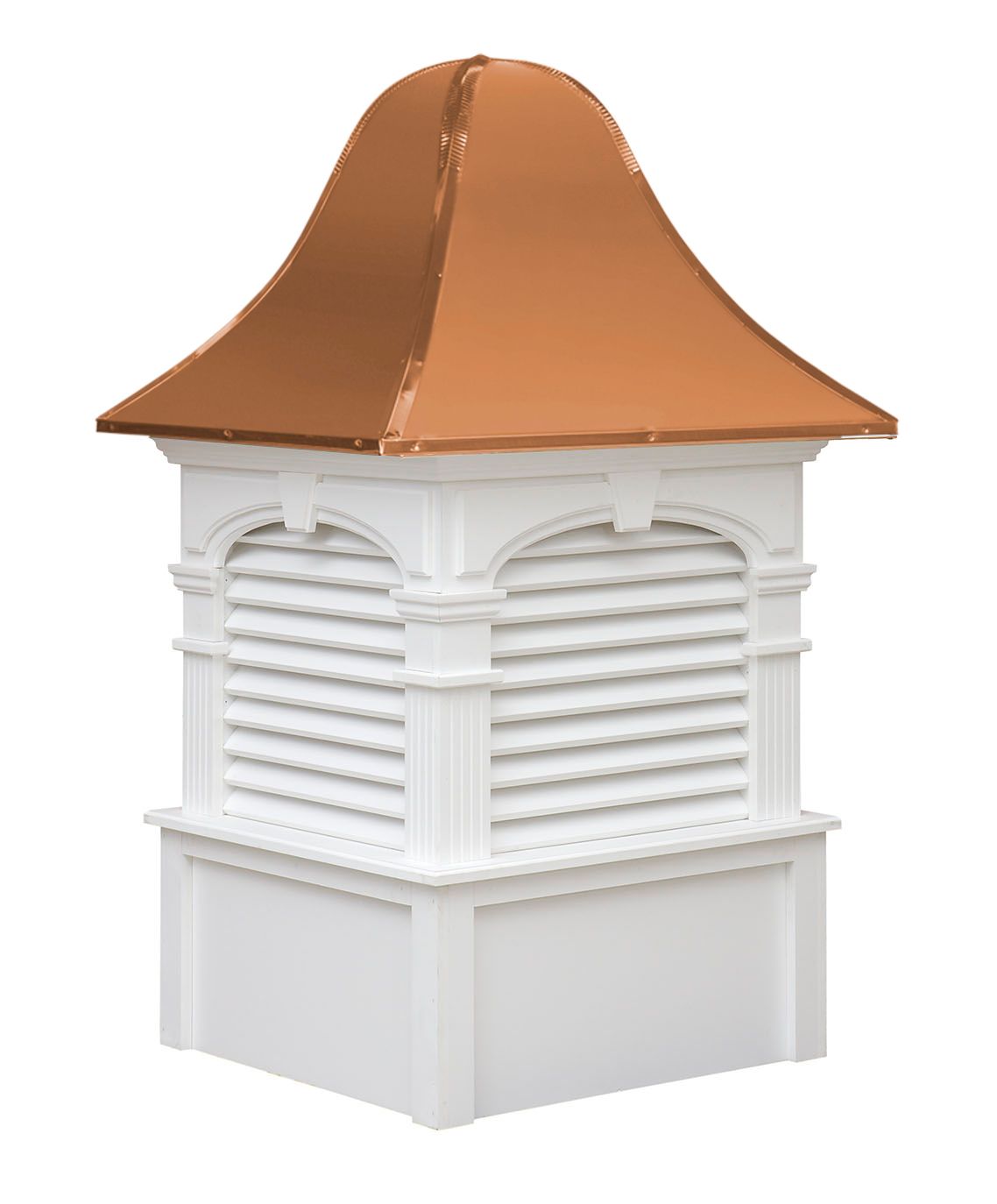 The Alexander cupola is highly detailed in construction & craftsmanship and is distinguished from any other cupola on the market today. The Alexander cupola is manufactured of a solid Vinyl-pvc trimboard or a Cedar-PVC trimboard & capped with a copper or metal roof. - Made from a rot free cellular-pvc trim & stainless steel fasteners that will stand the test of time. - Weathervane Mount standard. - Accomodate up to a 10/12 roof pitch. Base extensions are available for steeper pitch roofs. - Cupolas are engineered to withstand up to 120MPH winds. - Cupola size is determined from the width of the base. - Manufactured in USA by Royal Crowne.