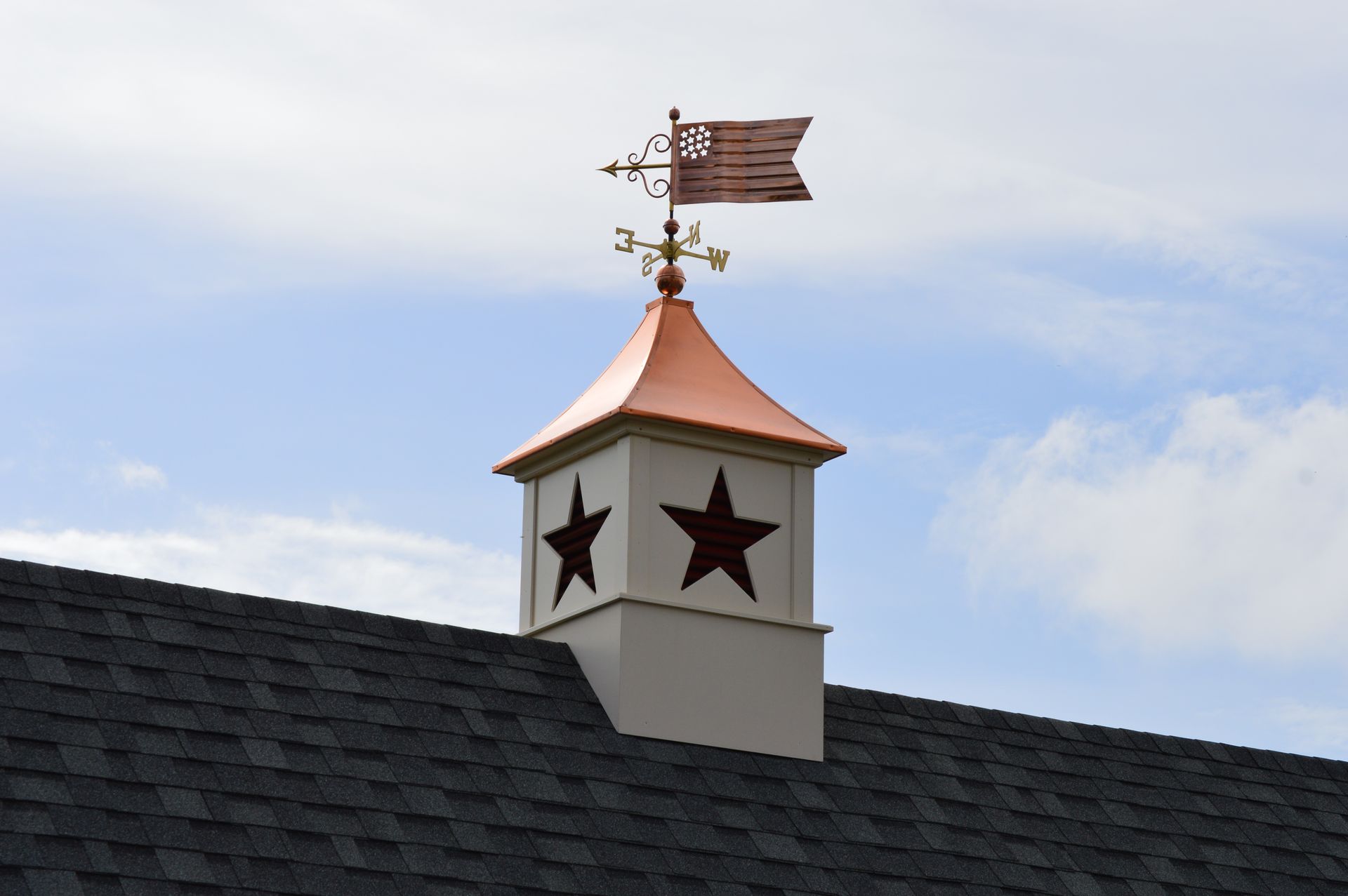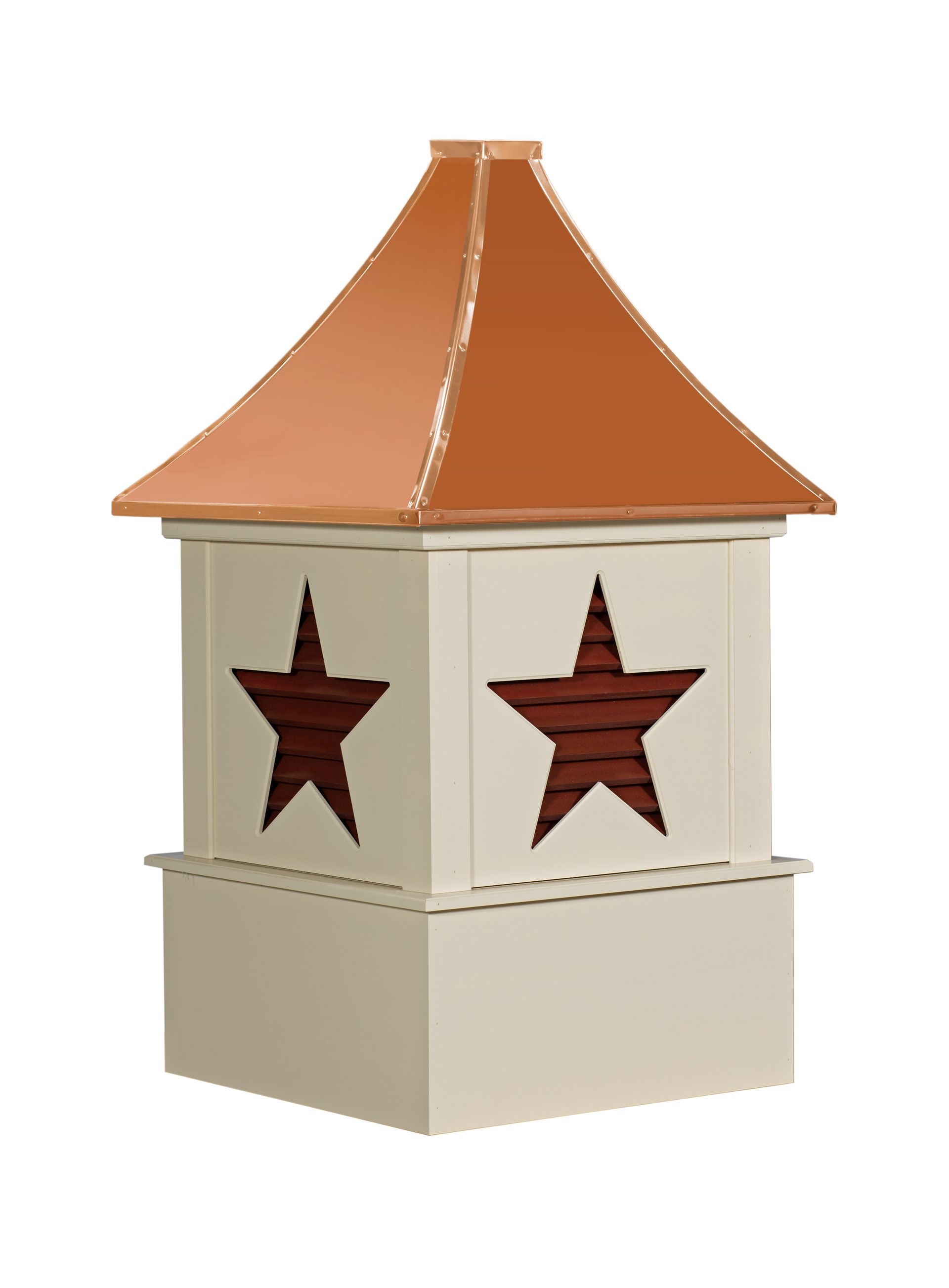 The Alpha cupola of our Designer Series is unique in design and will add charm & style to your building roof. With star louvers, The Alpha cupola is manufactured solely of a solid Vinyl-pvc trimboard, & capped with a copper or metal roof.