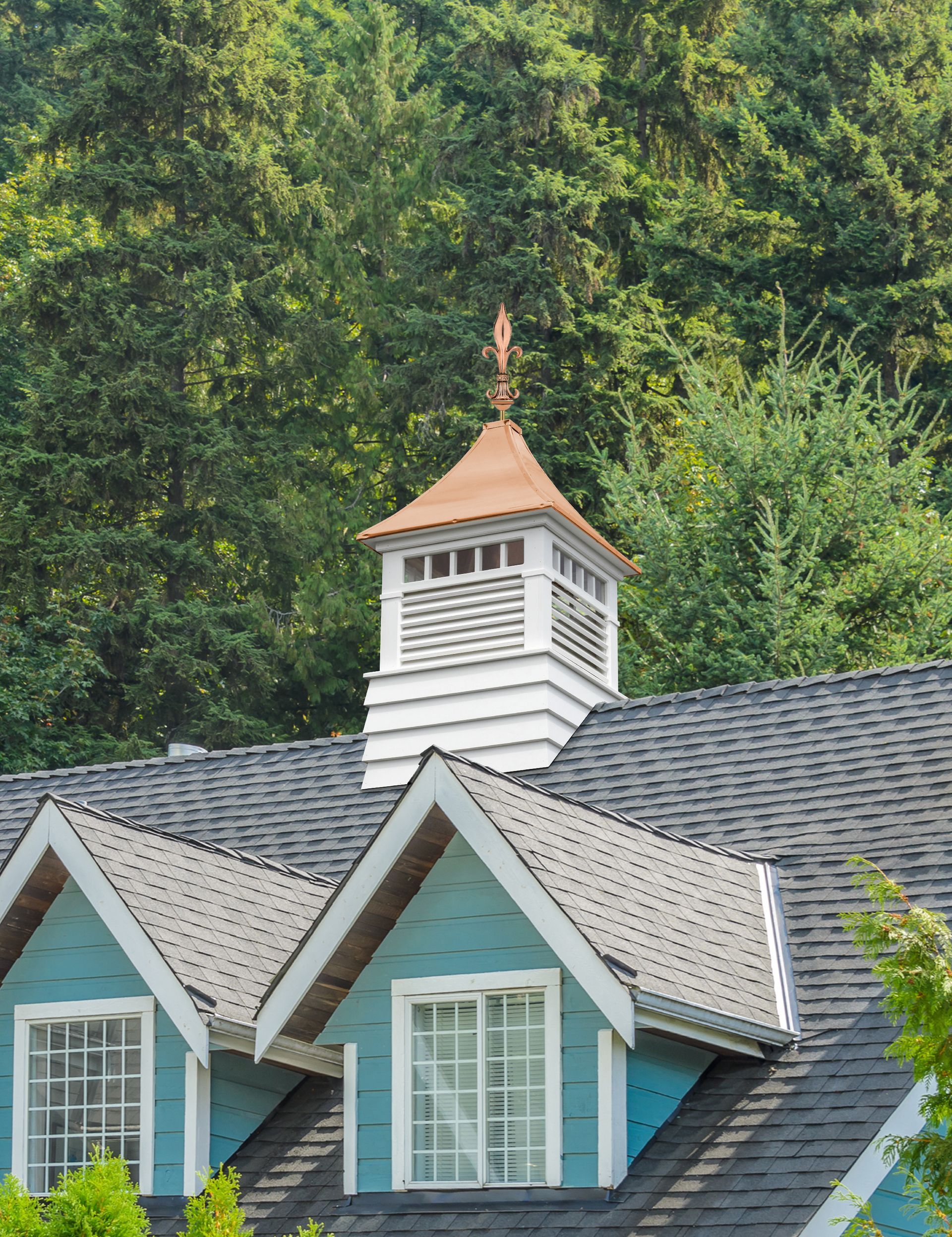 The Norwood cupola of our Select Series is the perfect addition to your garage or other outbuilding. With traditional style louvers & transom windows, The Norwood cupola is manufactured of a solid Vinyl-pvc trimboard, or the "NEW" Cedar-pvc material & capped with a copper or metal roof.