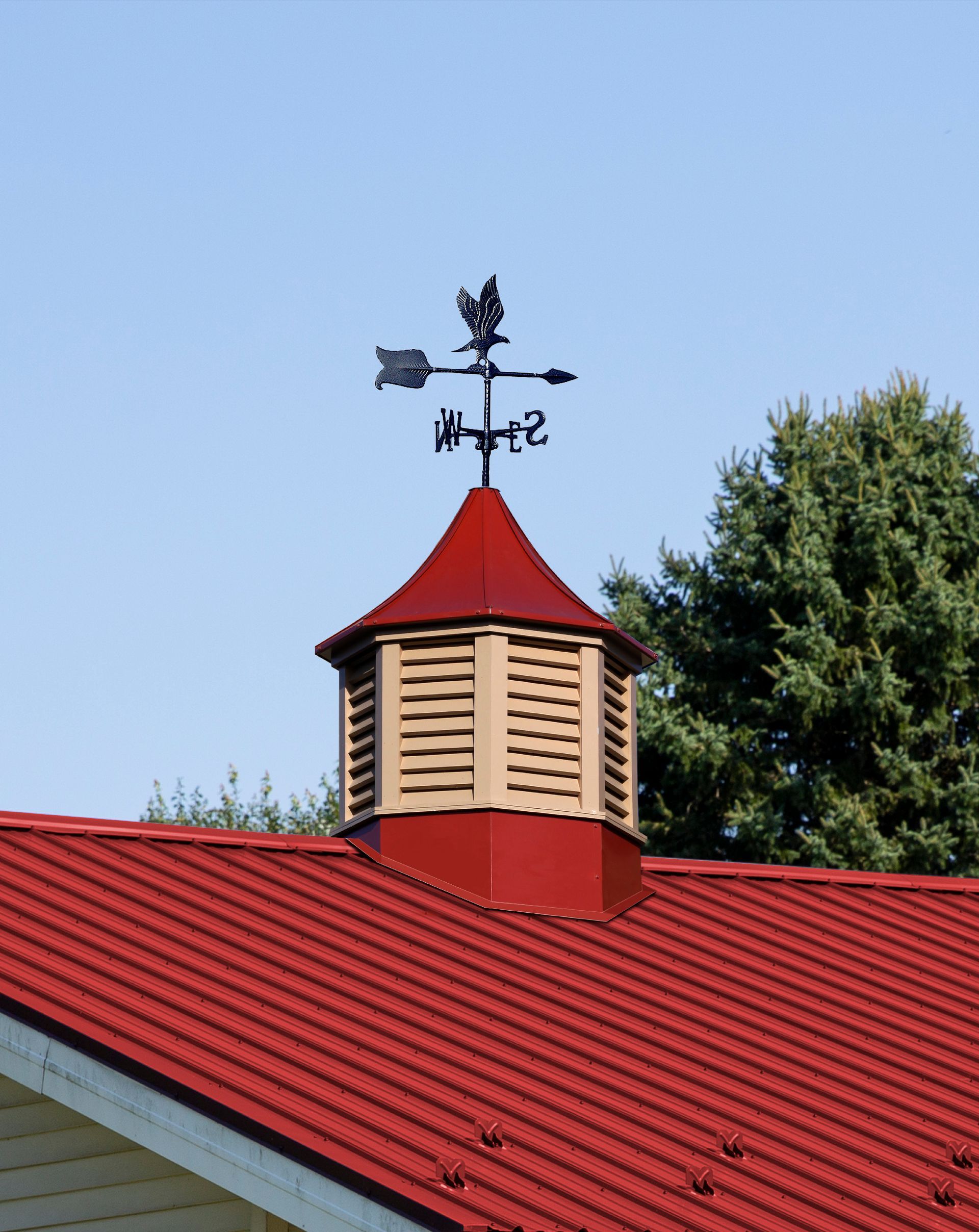 The Salem cupola of our Sundance Series is the perfect fit for your metal or commercial style building. With traditional style louvers, The Salem cupola is manufactured of a solid Vinyl-pvc trimboard, with a metal roof & base with many color options to match or accent your building colors.